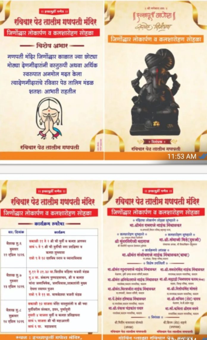 रविवार पेठ तालीम गणपती मंदिराचा जीर्णोद्धार लोकार्पण व कलशारोहण सोहळा