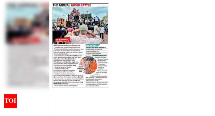 पुणे: कॉलेज ऑफ इंजिनीअरिंग पुणे (सीओईपी) टेक्नॉलॉजिकल युनिव्हर्सिटीच्या विद्यार्थ्यांनी गणपती विसर्जन-दिवसाच्या ध्वनी देखरेखीने यावर्षी ध्वनी पातळीवर किरकोळ घसरण नोंदविली असेल-(साथीचा रोग) सर्व देशभर (किंवा खंडभर) असलेला-परंतु एकूणच एक्सपोजरला परवानगी नसलेल्या मर्यादेपेक्षा जास्त चिंताजनक आहे.दोन दिवसांच्या विसर्जन (सप्टेंबर 6 आणि 7) दरम्यान लक्ष्मी रोडवरील 10 चोक्सवरील सरासरी आवाज 92.6 डेसिबल (डीबी) होता, गेल्या वर्षी 94.8 डीबीपेक्षा कमी होता. कोएप्टूने 2.2 डीबी गडी बाद होण्याचा क्रम सुधारित मिरवणुकीचे नियोजन, कडक गर्दी नियंत्रण, मंडल स्वयंसेवकांशी चांगले समन्वय आणि मध्यम नंतरच्या ध्वनी प्रणालींवर क्लॅम्पडाऊनचे श्रेय दिले.तथापि, वाचन केंद्रीय प्रदूषण नियंत्रण मंडळाच्या (सीपीसीबी) निकषांपेक्षा चांगले राहिले – निवासीसाठी 55 डीबी आणि दिवसा व्यावसायिक झोनसाठी 65 डीबी. कोएप्टू अभ्यासानुसार पारंपारिक साधनेदेखील सतत उच्च पातळीवर योगदान देत आहेत.बेलबाग चौक (.8 .8 .. डीबी) येथे सर्वात मोठा सरासरी नोंद झाली, त्यानंतर कुम्थेकर रोड (.2 .2 .२ डीबी) आणि होळकर चौक (.7 .7 .. डीबी).टोकाचा अगदी वेगळा होता: Sep सप्टेंबर रोजी खंदोजीबाबा चौक येथे शांत रेकॉर्ड केलेला क्षण .6१..6 डीबी होता, तर जोरदार स्पाइकने Sep सप्टेंबर रोजी सकाळी 8 वाजता कुम्तेकर चौकात 111.8 डीबीला ठोकले.एप्लाइड सायन्स अँड इंजीनियरिंग विभागाचे प्रमुख प्रोफेसर महेश शिंदीकर म्हणाले की, “हे स्विंग्स कसे प्रतिबिंबित करतात – डीजे, बँड किंवा स्थानिकीकृत एम्पलीफायर्स – स्वीकार्य मर्यादेच्या पलीकडे जाऊन एक्सपोजर चांगले.”एकूणच थेंब असूनही, काही चौक्सात वाढ दिसून आली. कुम्थेकर चौकने मागील वर्षी 94.9 डीबी ते 95.2 डीबी ते 95.2 डीबीवर ओलांडले आणि शेज चौकात 92.8 डीबी वरून 93.9 डीबी पर्यंत वाढ झाली. कोएप्टू स्टुडंट टीमने सांगितले की, “हे दर्शविते की काही खिशात इतरत्र सुधारणा असूनही नियमांचे उल्लंघन करणे सुरू आहे.”रहिवाशांसाठी मदत नगण्य होती. नारायण पेथची कौमुदी जोशी म्हणाली, “अधिका by ्यांनी कारवाई आणि बंदी असूनही आवाजाची पातळी कमी झाल्यासारखे दिसत नाही. थोडासा थेंब काही चांगले करत नाही. बरेच ज्येष्ठ नागरिक पेथ भागात राहतात आणि हे आवाज त्यांच्यासाठी हानिकारक सिद्ध करतात. “मोहित कंडलकर आणि श्रेया करांडे यांच्या नेतृत्वात कोएप्टू टीमने अनेक उपायांची शिफारस केली: कायमस्वरुपी डेसिबल डिस्प्ले, मिरवणुकीदरम्यान रिअल-टाइम ध्वनी देखरेख, एम्प्लिफाइड ध्वनीसाठी वेळ-प्रतिबंधित परवानग्या आणि प्लाझ्मा स्पीकर्सवरील क्रॅकडाउन. ते म्हणाले, “पोलिस आणि स्वयंसेवकांच्या समर्थनासह, मागील वर्षाच्या 118 डीबी प्रमाणे एकल-बिंदू शिखर-हे दर्शविते की नियामकांना दक्