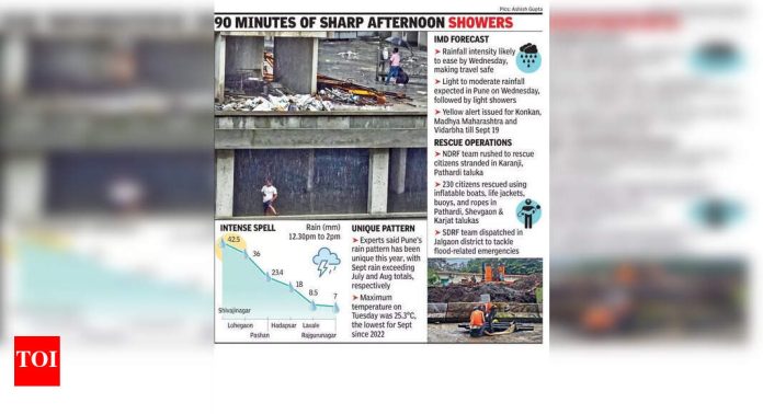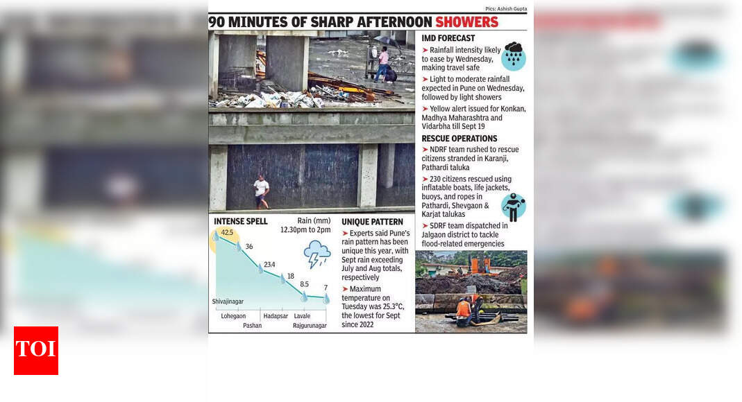 पुणे: मंगळवारी दुपारी १२.२० ते दुपारी १.30० या वेळेत पुणे शहरात अचानक पावसाचा स्फोट झाला, मंगळवारी पहाटे 24 तासांच्या कालावधीत पर्जन्यवृष्टीमध्ये लक्षणीय घट झाली. आयएमडी अधिका said ्यांनी सांगितले की, ओले स्पेलची तीव्रता बुधवारीपर्यंत कमी होण्याची शक्यता आहे, कारण पुणे येथून प्रवास करून घाट विभागांसह सामान्यत: सुरक्षित आहे.इंडिया मेटेरोलॉजिकल डिपार्टमेंट (आयएमडी) च्या मते, शिवाजीनगरने दुपारी १२.30० ते दुपारी २ या वेळेत 42.5 मिमी पाऊस नोंदविला, त्यानंतर लोहेगाव (36 मिमी), पशान (23.4 मिमी) आणि हदापसर (18 मिमी). या कालावधीत लवाळेला 8.5 मिमी पाऊस पडला, त्यानंतर राजगुरुनगर (7 मिमी). चिंचवड, मालिन आणि डुडल्गाव यांनी प्रत्येकी 2 मिमी पाऊस नोंदविला, हवेलीने फक्त 0.5 मिमी नोंदवले.आयएमडीच्या अधिका said ्यांनी सांगितले की एकूण पाऊस अपवादात्मकपणे जास्त नसला तरी, कित्येक तासांत पसरण्याऐवजी 90 ० मिनिटांच्या एका लहान विंडोमध्ये एकाग्रतेमुळे ती तीव्र दिसून आली. आयएमडीच्या एका अधिका said ्याने सांगितले की, “बुधवारीपासून पावसाची तीव्रता कमी होण्याची शक्यता आहे, ज्यामुळे घाट विभागांद्वारे प्रवास करणे मोठ्या प्रमाणात सुरक्षित होते. आमचा राष्ट्रीय अंदाज बुधवारी बुधवारी आणि गुरुवारच्या दरम्यान मध्यम महाराष्ट्र आणि मरथवाडा यांच्यावर वेगळ्या मुसळधार पावसामुळे अनेक ठिकाणी हलका ते मध्यम पाऊस किंवा गडगडाटी सूचित करते. बुधवारी पुणेला प्रकाश ते मध्यम पाऊस पडण्याची अपेक्षा आहे, त्यानंतर त्यानंतर हलके शॉवर. “मंगळवारपर्यंत लाल आणि केशरी सतर्कतेविरूद्ध हवामान ब्युरोने कोकण, मध्य महाराष्ट्र आणि विदर्भाला १ Sep सप्टेंबरपर्यंत पिवळ्या इशाराखाली ठेवले आहे. आत्तासाठी 19 सप्टेंबरच्या पलीकडे कोणताही इशारा देण्यात आला नाही. गेल्या काही दिवसांपासून सुरू असलेल्या मुसळधार पावसामुळे महाराष्ट्राच्या भागातील पिकांचे व्यापक नुकसान झाले आणि अनेक आपत्कालीन परिस्थितीला चालना मिळाली. राज्य आपत्ती व्यवस्थापन विभागाच्या म्हणण्यानुसार, एनडीआरएफच्या पथकास अहिलियानगर जिल्ह्यातील पथार्डी तालुकामधील करांजीत अडकलेल्या नागरिकांना वाचवण्यासाठी तातडीने दाखल करण्यात आले. पूर जिल्हा प्रशासन आणि पोलिस यांच्या समन्वयाने राज्य आपत्कालीन ऑपरेशन सेंटर (एसईओसी) च्या माध्यमातून ग्रीन कॉरिडॉरची सोय केली गेली. पठार्डी, शेवगाव आणि कारजात तालुकासमधील बचाव ऑपरेशनमध्ये 230 नागरिकांना इन्फ्लेटेबल बोटी, लाइफ जॅकेट्स, बुईज आणि दोरीचा वापर करून वाचविण्यात आले.“राज्य आपत्ती व्यवस्थापन विभागातील मदत सामग्री नगरपालिका, परिषद आणि तहसील कार्यालयांना असुरक्षित भागात तैनात करण्यासाठी आगाऊ वाटप करण्यात आली. परभानी जिल्ह्यात,